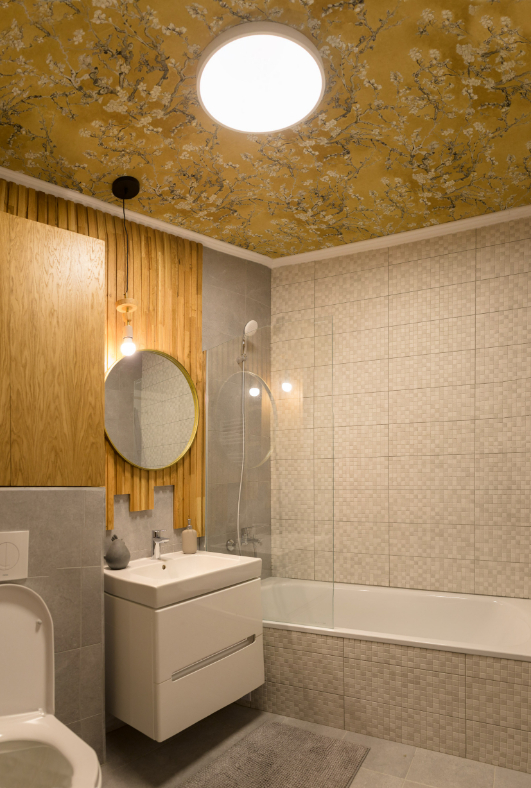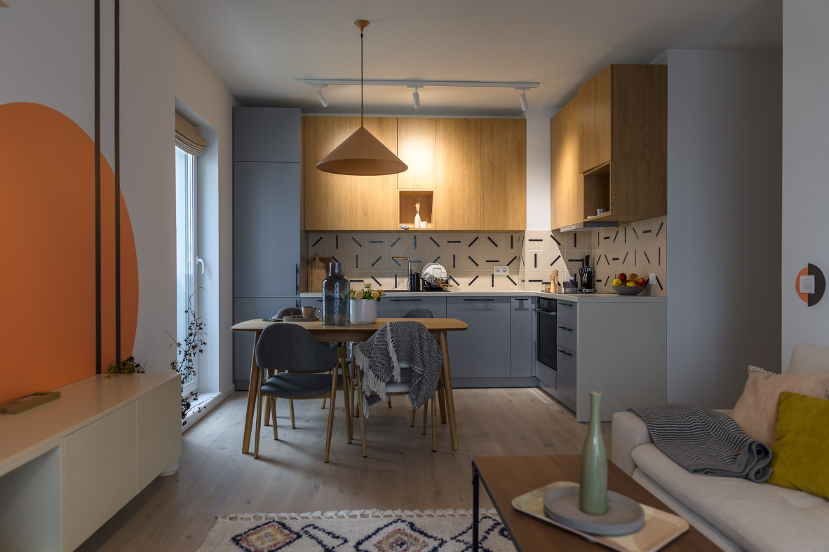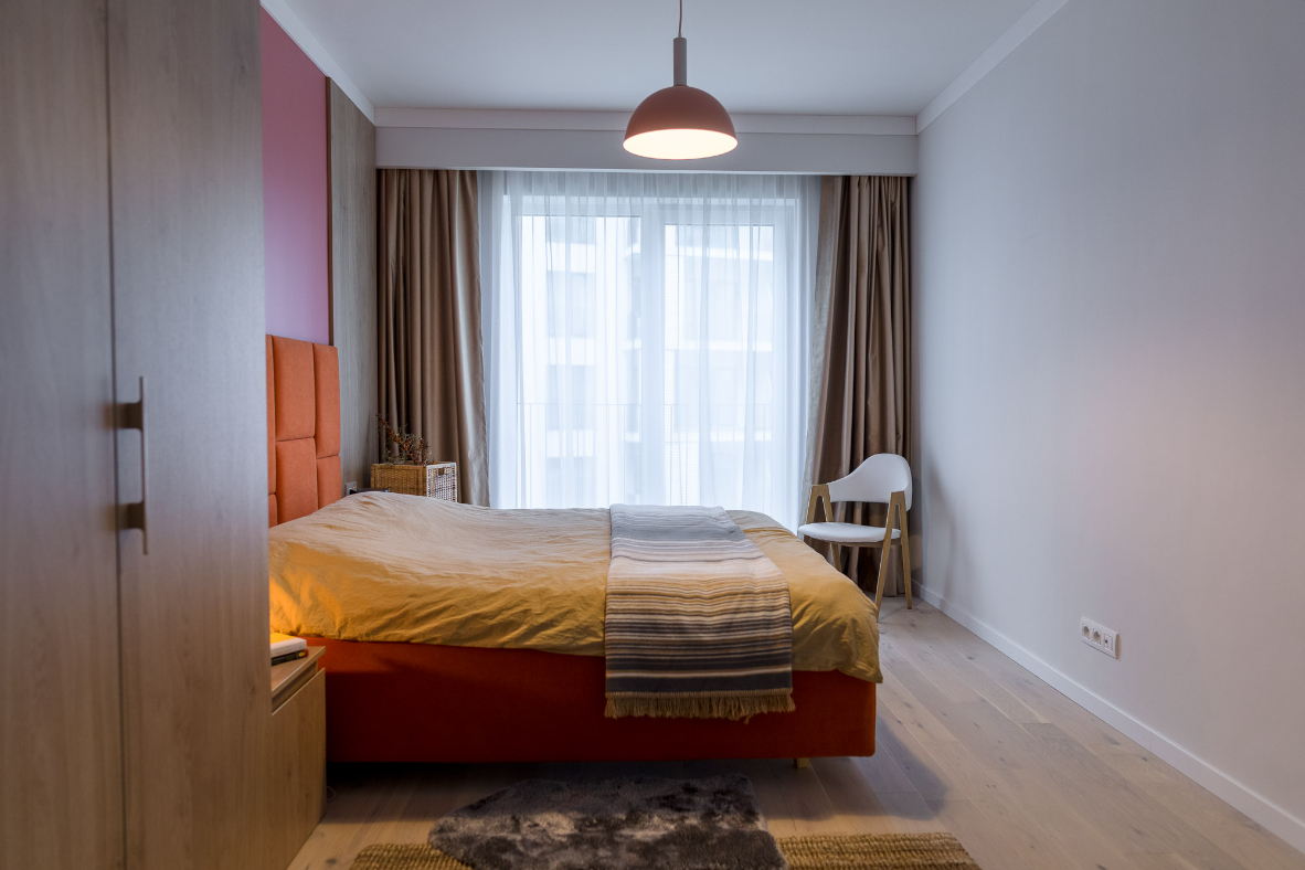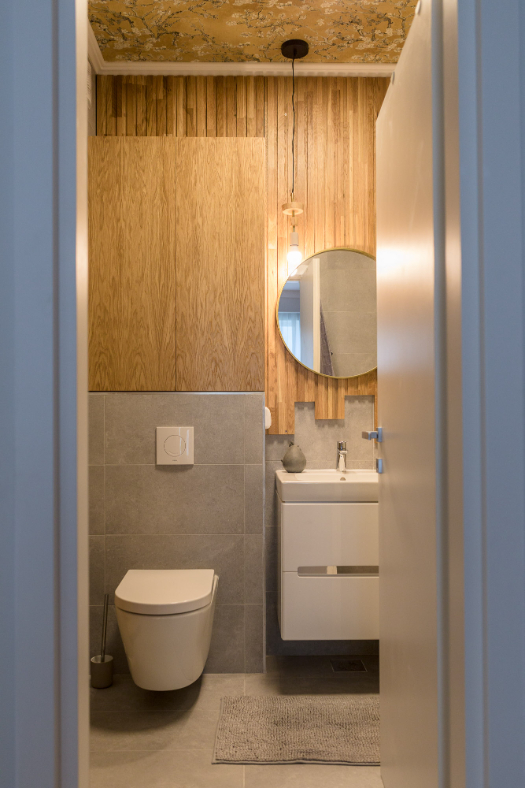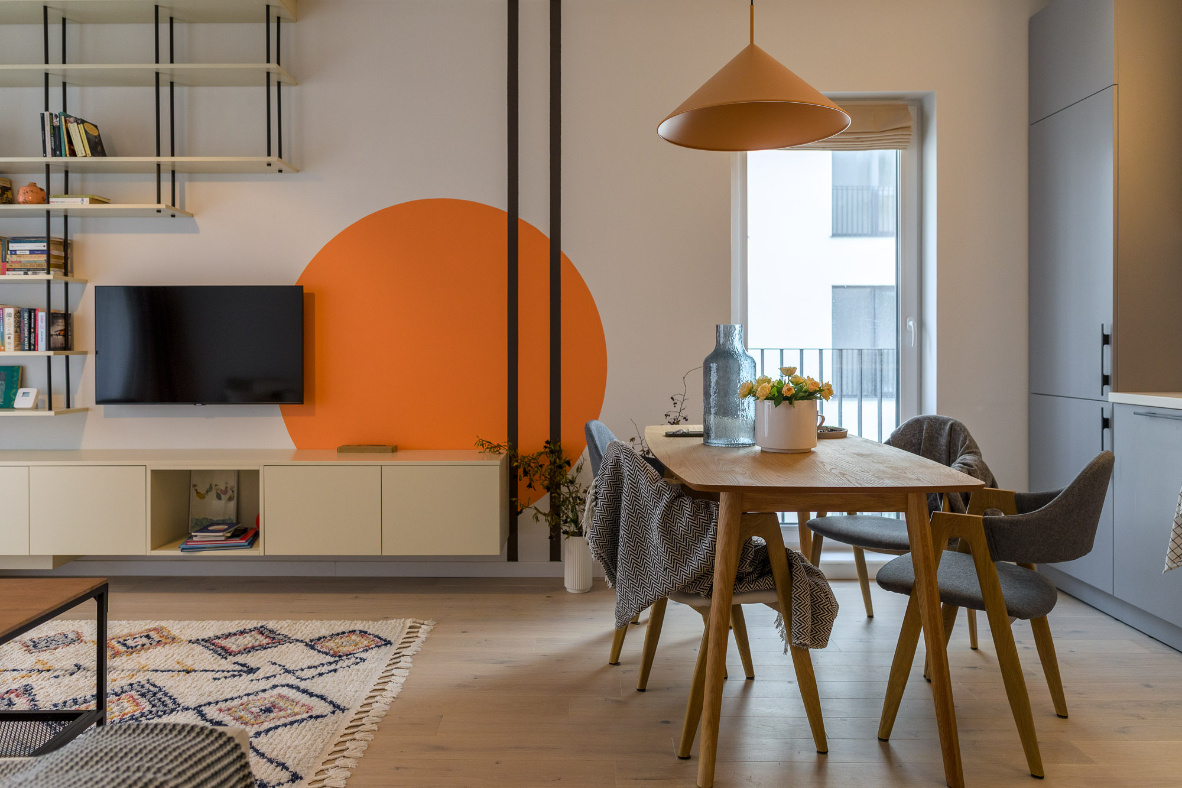 Project team: Camelia Popa, Cimpean Bianca Status: Finished 2021 Photography: Flaviu Tanase An apartment full of character, where color is the main theme. From the beginning, the owner expressed her wish to have a colorful interior, not fearing that it might be too much. Therefore, every room has a warm color palette and expresses the owner’s personality. Throughout the apartment, except the bedroom. we can find bookshelves and spaces designated for book storage, reading being the main theme we had în mind when designing the rooms. That’s why there are also small reading corners and texture and fabric layerings that cohesively express a sense of warmth and coziness. The bathrooms were already finished with tiles and sanitary objects when we met the client. The lifeless and basic grey colored tiles were revived with wooden furniture, golden mirrors and LED lights. The ceiling is covered în a vibrant Van Gogh inspired wallpaper that gives the room a more joyful and original touch. The guest room is also used as a home office, that’s the reason why we chose LED ceiling lights and bookshelves cover a big part of the wall. În the bedroom, the storage space was maximised; not having a separate dressing room, it was needed. The bold pink-burnt orange color combination was exactly what we needed to spice up the room.